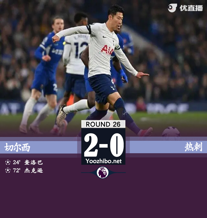 直播车讯:北京时间5月3日,英超第26轮补赛,切尔西主场迎战热刺。上半场,杰克逊失单刀,帕尔默补射空门打飞,查洛巴头球建功先拔头筹。易边再战,杰克逊头球补射破门。最终切尔西2-0热刺。积分榜方面,切尔西51分暂升第八,热刺60分仍第五。