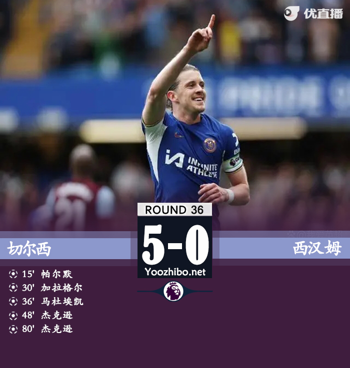 直播车讯:北京时间5月5日21时,英超第36轮,切尔西主场迎战西汉姆联。上半场,帕尔默破门为切尔西首开纪录,加拉格尔和马杜埃凯连入两球扩大比分优势,半场双方击中三次门框,加拉格尔一次,鲍文两次!半场战罢,切尔西暂3-0西汉姆联;下半场,杰克逊连入两球上演梅开二度,恩昆库替补出场,鲍文本场第三次击中门框!全场比赛结束,切尔西5-0西汉姆联!