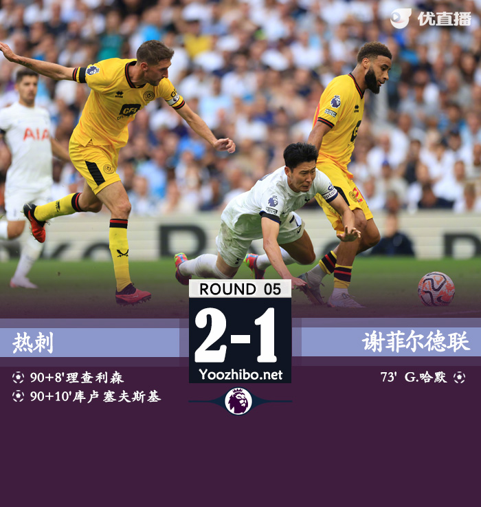 直播车讯 北京时间9月16日22点,英超第5轮热刺对阵谢菲尔德联。上半场,热刺场面占据绝对主动但没有制造出绝对的得分机会,谢菲尔德联错失一次不错机会。下半场,热刺依旧久攻不下,哈默打破僵局,约翰逊打进一球但越位在先无效,理查利森替补登场补时阶段扳平比分并且3分钟后助攻库卢塞夫斯基完成绝杀,麦克伯尼两黄变一红被罚下。全场比赛结束,热刺2-1谢菲尔德联。
