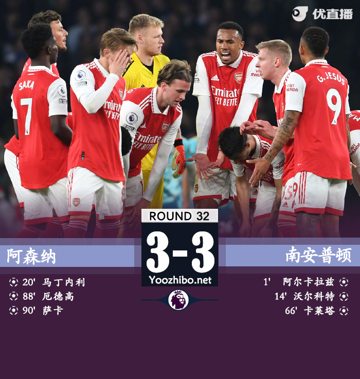 直播车讯 北京时间4月22日03:00,英超联赛第32轮阿森纳迎战南安普顿的比赛,上半场拉姆斯代尔开场送礼阿尔卡拉斯抽射破门,随后沃尔科特推射建功,马丁内利凌空爆射扳回一城,半场结束,阿森纳1-2南安普顿。下半场卡尔头球扩大比分,厄德高远射破门,萨卡补射扳平。最终,阿森纳3-3南安普顿三轮不胜。