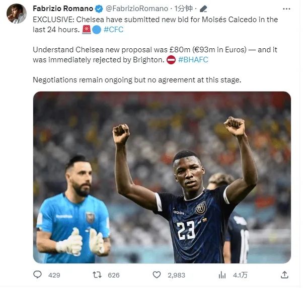 直播车讯07月28日据知名转会记者罗马诺报道,布莱顿拒绝了切尔西第三次8000万英镑报价凯塞多。