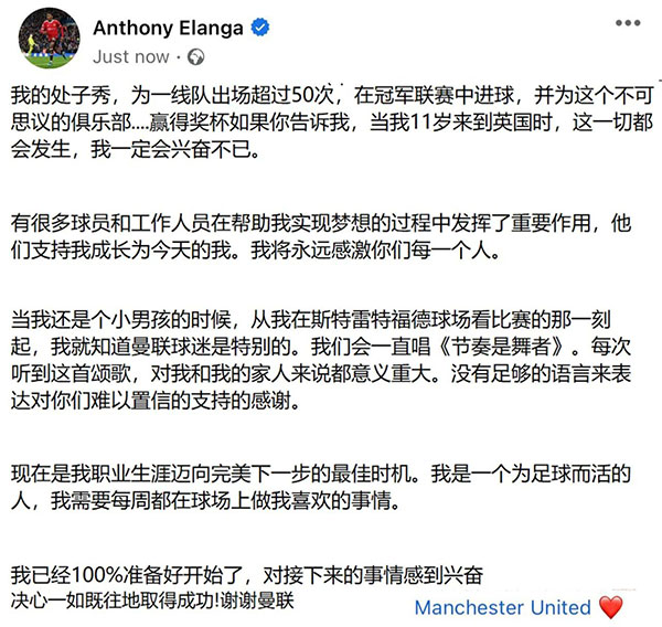 来源:直播车07-26 19:13直播车讯07月26日曼联与诺丁汉森林周二官方宣布,21岁的瑞典国脚埃兰加以1500万英镑的价格完成转会,他签署了一份为期5年的合同,身披21号战袍。这名12岁加盟曼联,2021年完成首秀并出场55次打入4球的快马,正式结束红魔生涯。