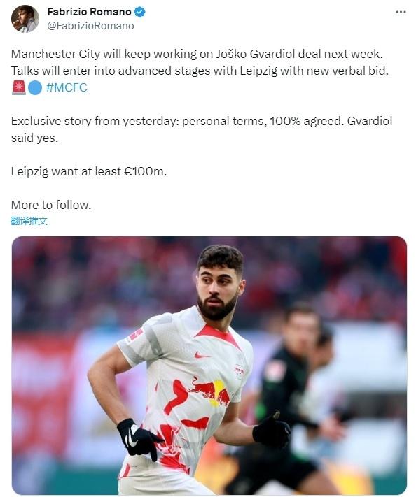 北京时间6月25日晚,来自知名转会专家罗马诺的消息,曼城已与格瓦迪奥尔就个人条款100%达成协议,格瓦迪奥尔已同意加盟。曼城将在下周持续处理格瓦迪奥尔的转会。目前球队与莱比锡已经就新的口头协议谈判,进入了后期阶段。