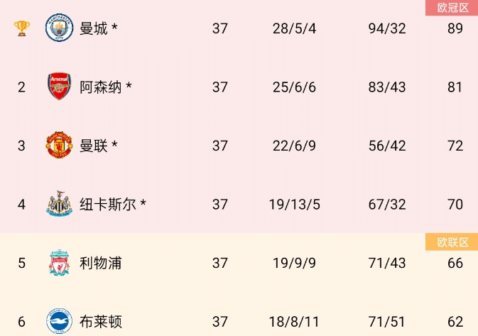 来源:直播车05-26 09:32直播车05月26日本赛季英超联赛只剩下一轮,随着补赛的曼联主场4-1战胜切尔西,锁定欧冠资格,这样前六名正式确定,参加下个赛季欧冠的球队是冠军曼城、亚军阿森纳和曼联、纽卡斯尔。第五名的利物浦和第六名的布莱顿参加下个赛季的欧联杯。