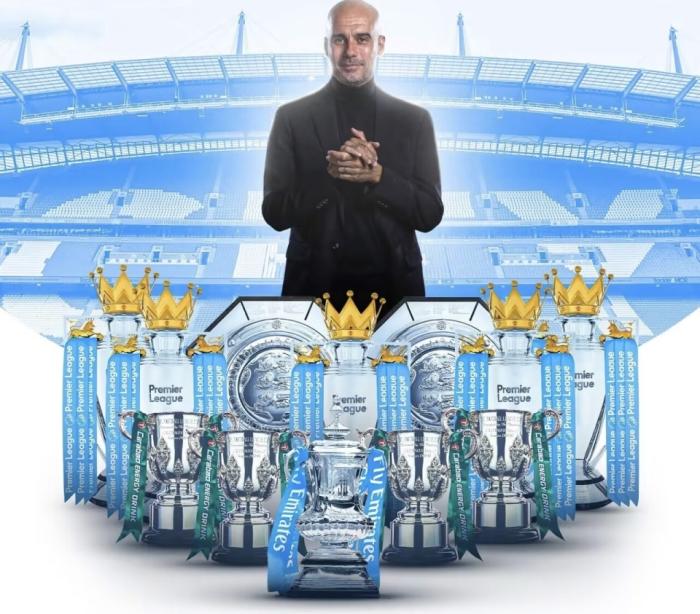 曼城卫冕后瓜帅霸气伸出3指!在3大联赛实现3连冠伟业,创7大神迹