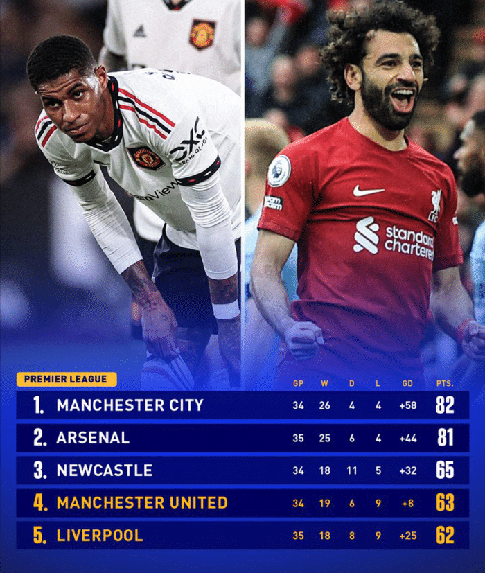 曼联和纽卡斯尔掌握主动权,红魔再拿9分、喜鹊再拿7分,就可以超过利物浦的最高积分71分上限,确保自己在赛季结束时排名前四。但如果出现同分现象,那么曼联将处于劣势,因为滕哈格的球队目前只有8个净胜球,纽卡斯尔多达32个,利物浦也有25个,可以确信剩余的4轮曼联不可能弥补如此大的差距。