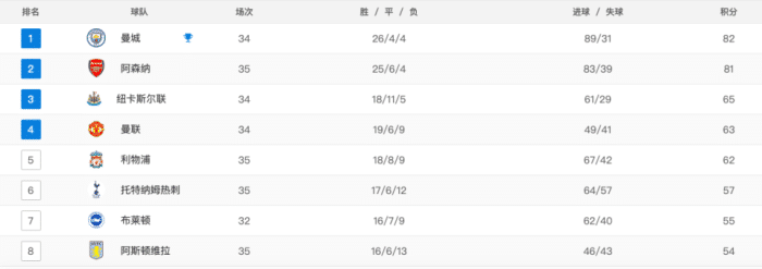 来源:直播车05-08 11:47直播车05月08日,英超联赛第35轮结束了两场焦点战角逐。最终曼联客场0-1输给西汉姆联,而纽卡斯尔则主场0-2被阿森纳终结了3连胜的步伐。在纽卡和曼联先后输球后,本赛季英超争四悬念重新燃起。