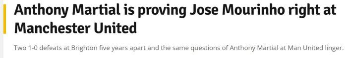4年前此时,曼联也在客场0-1不敌布莱顿,马夏尔和拉什福德联袂首发,赛后穆帅表示:「我想你们应该感到失望,我说的就是你们英媒。几个月来,你们总问我为什么不用这个球员,为什么不用那个球员,为什么他们坐在板凳上,总是卢卡库那家伙上阵?现在,我认为你们应该比我更失望,因为我了解阵中的球员,而你们并不知晓,所以总是质疑。」