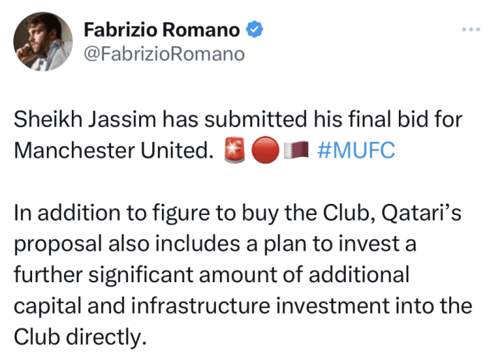 卡塔尔财团提交最终报价!超50亿镑创纪录,开3诱人条件