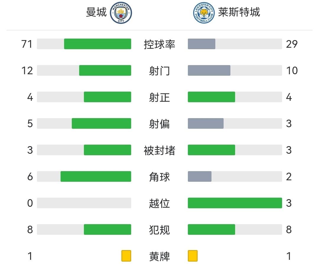 第5分钟,曼城取得领先,马赫雷斯右路角球制造莱斯特城禁区内一片乱战,斯通斯禁区线前左脚凌空抽射破门,曼城1-0领先莱斯特城。