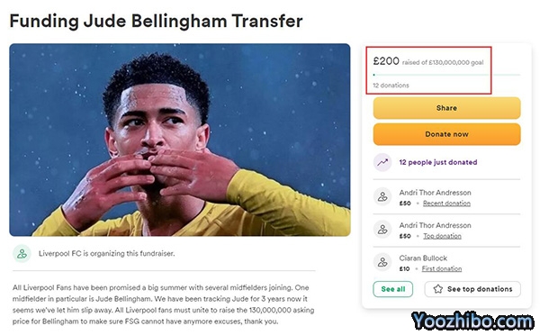 许多红军球迷对此感到非常失望,于是有人在众筹网站发起项目,为俱乐部能够签约贝林厄姆筹集1.3亿英镑资金,让芬威集团不再有借口不买人。