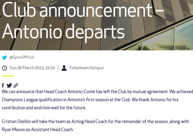 热刺宣布孔蒂下课!本赛季带队四大皆空+炮轰球员自私,代理主帅出炉