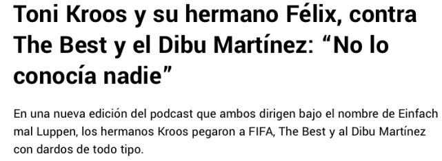 来源:直播车03-02 17:23直播车讯03月02日国际足联年度最佳颁奖典礼已经结束,尽管各大奖项已经尘埃落定,但一些质疑声却依然没有消失。北京时间3月1日晚,皇马巨星托尼-克罗斯和他的弟弟菲利克斯-克罗斯,在一档播客节目Einfach mal Luppen中谈到了对于得奖结果的看法。菲利克斯-克罗斯语出惊人表示,梅西不是过去1年的最佳球员,大马丁当选最佳门将更是个笑话。