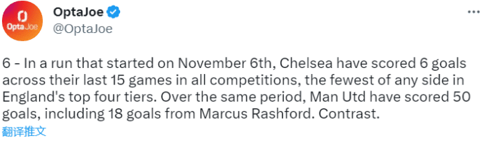 Opta表示,从11月6日到现在,切尔西一共进行了15场比赛,但是他们只打进了6粒进球,是同期英格兰4个级别职业联赛中进球最少的一支球队。