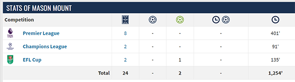 数据显示,芒特加盟后只为曼联踢了12场比赛,仅有一次打满全场,本赛季他的出勤率在阵中仅高于至今没有出场的左后卫泰雷尔·马拉西亚,甚至还不如「玻璃之王」马夏尔。