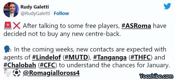 今夏,罗马联系过多名自由球员,但最终没有引进新中卫。他们接下来将会与3名目标球员的经纪人展开接洽,其中包括曼联的林德勒夫、热刺的贾费特·坦甘加和切尔西的查洛巴。但罗马并没有充足的转会预算,这是穆帅引进林德勒夫的最大障碍。