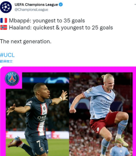 来源:直播车09-07 17:28直播车09月07日讯 欧冠重燃战火,哈兰德和姆巴佩都有亮眼的表现,姆巴佩面对尤文图斯梅开二度,哈兰德在对阵塞维利亚的时候也完成双响,不出意外的话,这对“新绝代双骄”将会争夺本赛季欧冠金靴。包括欧冠官推也晒除了姆巴佩和哈兰德的照片,配文:下一代。