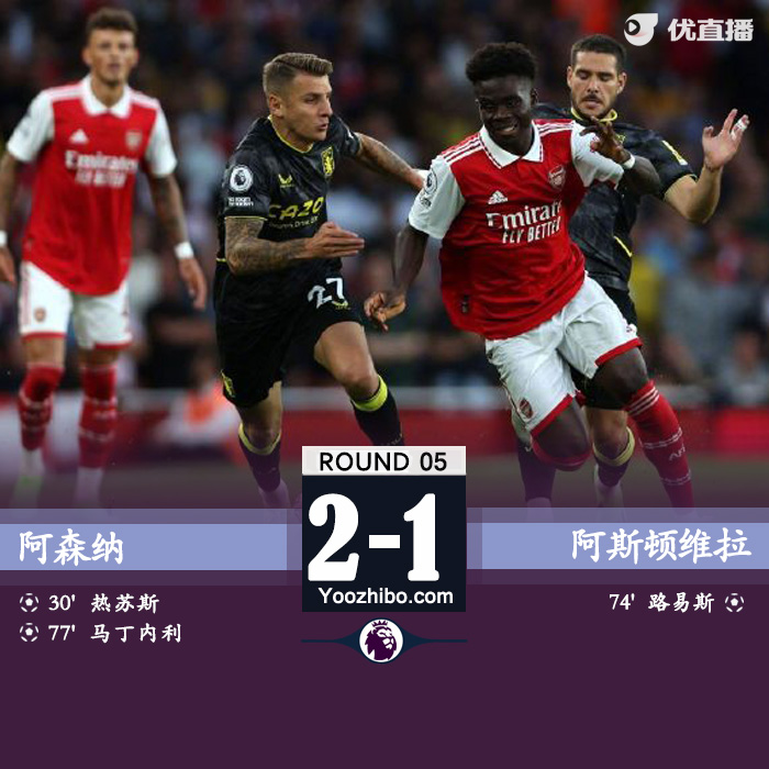 第77分钟,阿森纳再次将比分超出,萨卡挑传后点,马丁内利左脚将球打进,阿森纳2-1维拉。