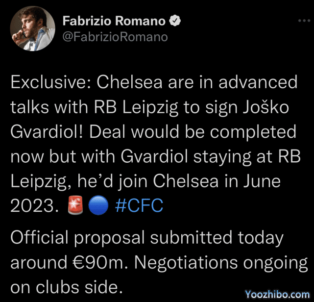 来源:直播车08-31 20:23直播车08月31日讯 凌晨,来自意大利天空体育著名记者Fabrizio Romano的独家报道,切尔西正在就克罗地亚国脚中卫格瓦迪奥尔的交易,和莱比锡红牛队进行深入谈判。