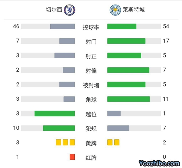 全场比赛结束,切尔西2-1莱斯特城。