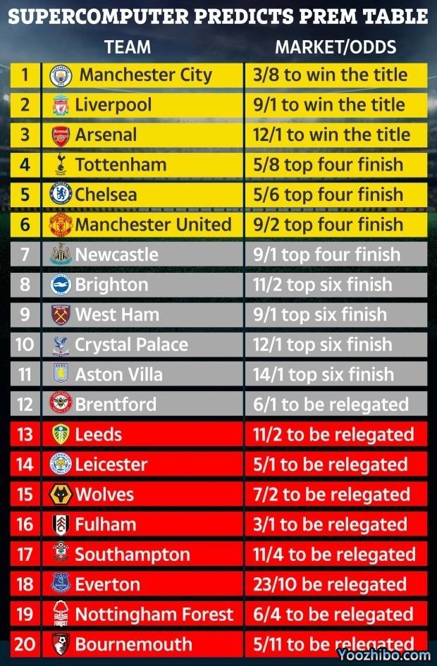 直播车08月24日讯 据《太阳报》报道,超级计算机预测本赛季英超冠军将由曼城获得,利物浦、阿森纳和热刺则分别排名2-4位。