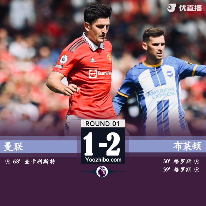 来源:直播车08-08 01:10 直播车讯:北京时间8月7日晚间21:00,英超联赛第1轮,曼联对阵布莱顿。上半场,达洛特、弗雷德相继失误险些丢球,格罗斯9分钟内连入两球,曼联未创造出进球良机。下半场,拉什福德屡失良机,麦卡利斯特乌龙送礼。最终,曼联1-2不敌布莱顿。
