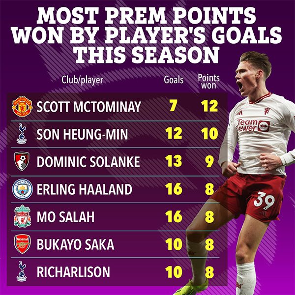 本赛季,麦克托米内在英超并列替补进球最多,在曼联独占联赛射手榜第一,他挣到的积分占据红魔分数的30%!在英超球员进球拿分贡献排行榜,麦克托米内力压热刺的孙兴慜,如果没有小麦的进球,曼联的积分将不得不减少12分,只能排名第12位,离降级区只有9分,根本不可能争四。