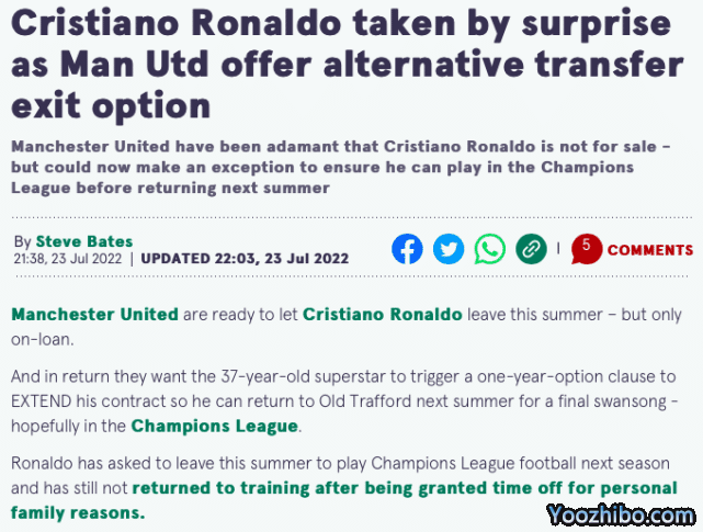 来源:直播车07-24 11:36直播车07月24日讯 ,来自英国知名媒体《每日镜报》的独家消息,曼联俱乐部决定选择妥协,同意放C罗离队。不过曼联放行C罗也是有条件的,那就是C罗必须先续约1年,然后以租借的方式离队,明年夏天再回归曼联。