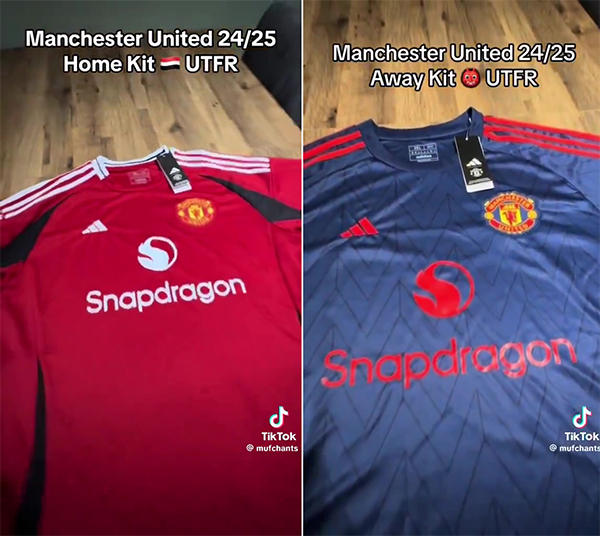 这套据称是2024/25赛季曼联球衣的款式,拥有黑色纹路,与小贝离开曼联前和C罗刚加盟时的球衣类似。无独有偶,新的胸前赞助商骁龙的标志,也跟20年前的沃达丰颇为类似。