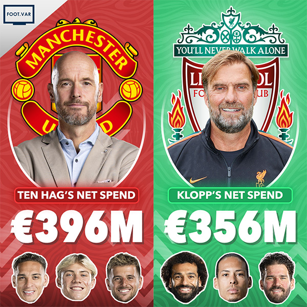 还有人对比了滕哈格执教曼联与克洛普在利物浦的转会净支出,红魔主帅已经超越了在安菲尔德时间更久的渣叔,花了更多的钱。不过,这主要是由于曼联转会部门在卖人上能力有限,只能以「白菜价」出售本队球员的缘故。