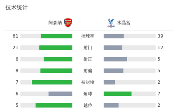 阿森纳5-0水晶宫 加布头球+造乌龙马丁内利双响