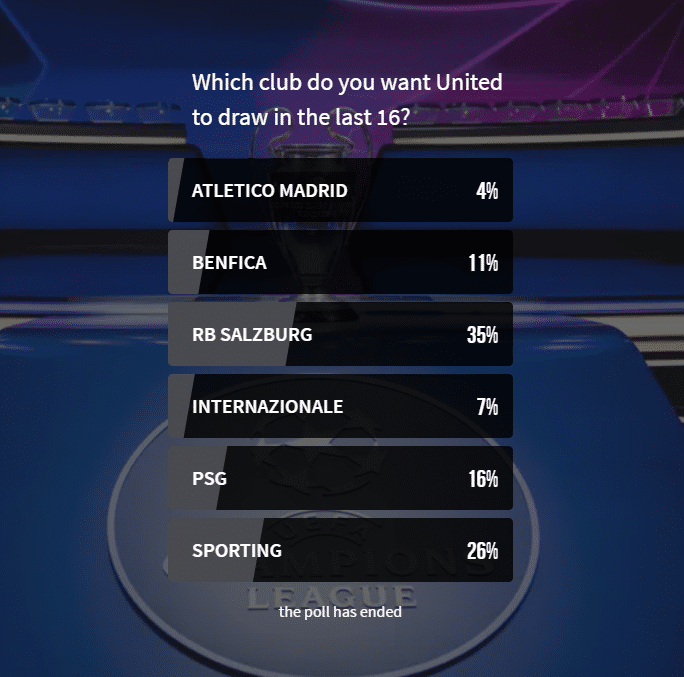 直播车12月10日讯 曼联日前在官网向球迷发起调查,了解球迷最希望在欧冠16强遇到哪支球队,最终萨尔茨堡红牛排名第一。