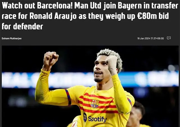 直播车01月17日讯 据德国天空电视台报道,曼联是最新一支对阿劳霍感兴趣的球队,并已向巴塞罗那提出正式报价。