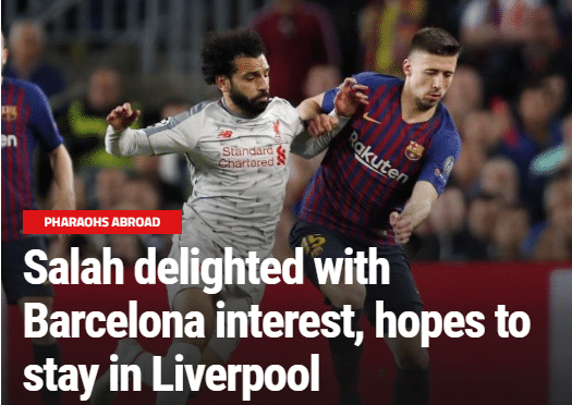 萨拉赫表示:“梅西加盟巴黎圣日耳曼和C罗加盟曼联不同,因为梅西在巴塞罗那效力了20年,和C罗不一样,他已经换了几次联赛。”