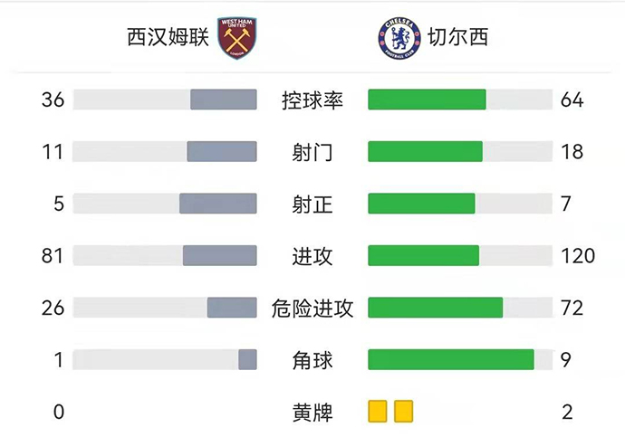 4分钟补时后全场比赛结束,最终切尔西客场2-3遭西汉姆联逆转。