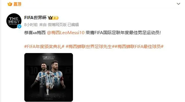 直播车01月16日讯 凌晨,2023国际足联颁奖典礼在伦敦举行,梅西击败哈兰德和姆巴佩,第8次获得世界足球先生。
