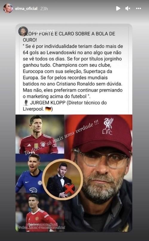 在这位球迷发布的动态中,利物浦主帅克洛普对金球奖结果进行了评论。渣叔表示,如果看个人表现,今年金球奖该给进了64个球的莱万,如果看冠军数量,金球奖该给拿欧冠、欧洲杯和欧洲超级杯的若日尼奥,而如果考虑创造的纪录那该给C罗,但今年的金球奖都不是,金球奖是为营销而颁奖。