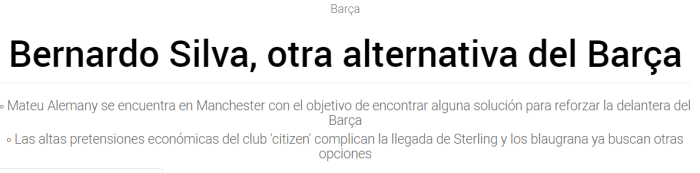 直播车11月27日讯 据西班牙媒体《每日体育报》报道,除了斯特林和费兰-托雷斯外,巴萨还在关注曼城的边锋贝尔纳多-席尔瓦。