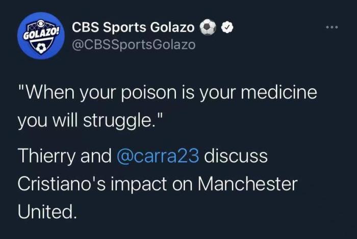 亨利说:“没错,当你的毒药就是你的解药时,你会很挣扎。我完全同意C罗拯救了曼联这个观点,但比赛中也会暴露问题,曼联没有整体的参与防守,如果做不到这点,就无法争夺英超或欧冠冠军。如果你想赢得冠军,那所有人都得跑起来。”