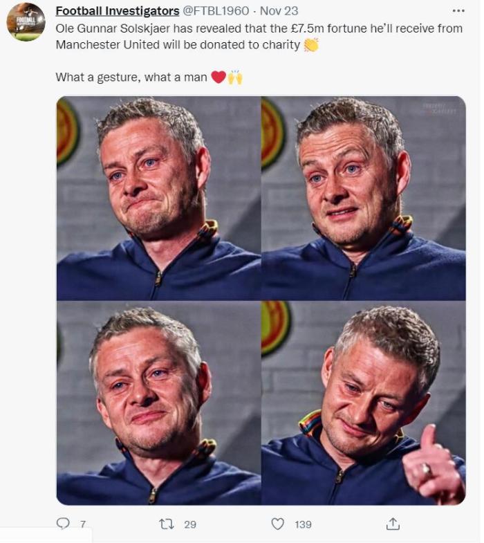 当然,这一消息并未得到确切来源证实,这一说法最早在11月23日,由一个名为「Football Investigators」的账号发布。其报道称:「索尔斯克亚透露,从曼联得到的750万英镑财富,将会捐献给慈善。多棒的做法,多棒的一个人。」