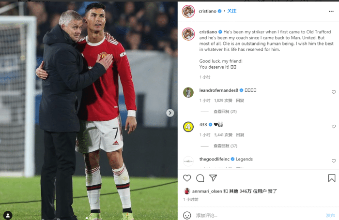 直播车讯 C罗在INS上写道:“我第一次来到老特拉福德时,他是我的锋线搭档,我回到曼联时,他是我的主教练。但最重要的是,奥莱是一个非凡的人。不管他将来的生活如何,我祝他一切都好。祝你好运,我的朋友,你配得上我的祝福!”