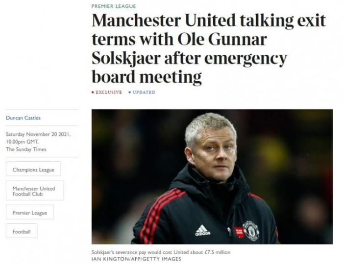 直播车11月21日讯 据《泰晤士报》记者邓肯-卡斯尔斯报道,在今天凌晨1-4惨败沃特福德后,曼联高层召开了紧急会议,并决定解雇索尔斯克亚,索帅将拿到大约750万英镑的解约金。