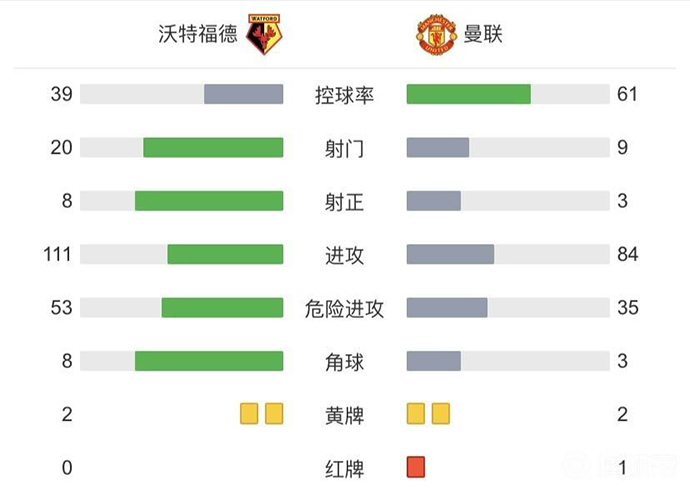 全场比赛结束,曼联1-4沃特福德。