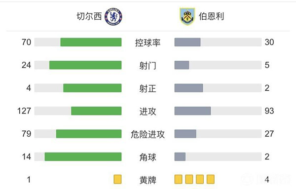 全场比赛结束,切尔西最终1-1战平伯恩利。