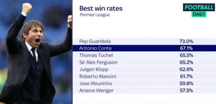 这家媒体统计了所有在英超执教或执教过至少20场比赛的教练的胜率,曼城主教练瓜迪奥拉以73%的胜率排名第一,而热刺新帅孔蒂则排名第二,蓝军主帅图赫尔排名第三。