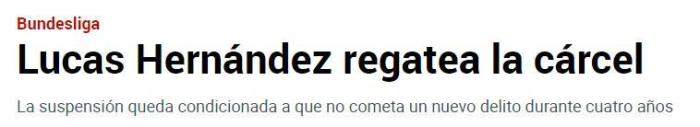 来源:直播车10-28 15:27直播车10月28日讯 据《马卡报》等多家西班牙媒体报道,法国后卫卢卡斯-埃尔南德斯无需入狱服刑,只需缴纳9.6万欧元罚款同时保证自己4年内不再犯罪。