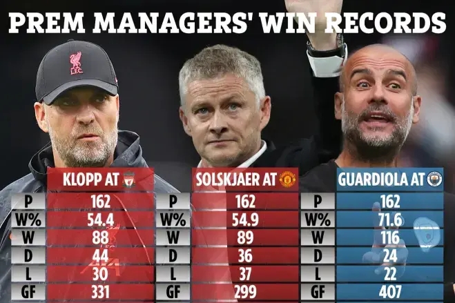 统计结果表明,执教各自球队162场后,克洛普战绩为88胜44平30负,进331球丢172球,胜率54.4%,索尔斯克亚战绩89胜36平37负,进299球丢168球,胜率54.9%,瓜帅战绩116胜24平22负,进407球丢139球,胜率高达71.6%。