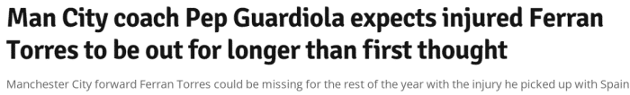 曼城没前锋了!费兰-托雷斯将缺席10-12周