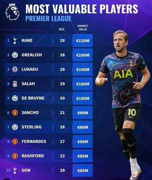英超球员身价排行榜: