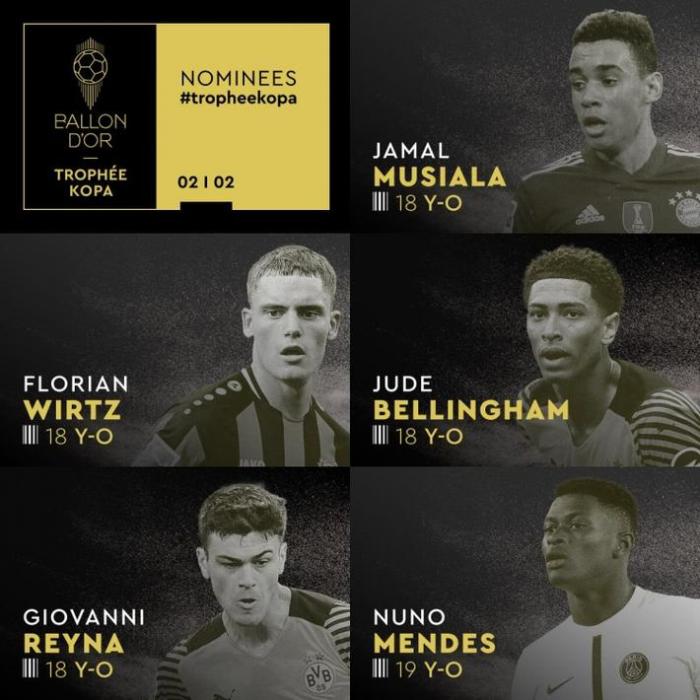 维尔茨(德国)、雷纳(美国)、穆西亚拉(德国)、贝林厄姆(英格兰)、门德斯(葡萄牙)